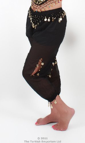 Bauchtanz Hose Hosenrock Übungshose Jogginghose Sporthose am Bund Wunderschöne Bauchtanzhose mit Münzen behangen - schwarz / gold..