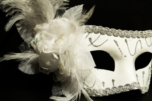 Cindio Venezianische Maske für Karneval Fasching - Venezia-Style mit Feder, Rose und Satinband für Damen - in weiss Feature